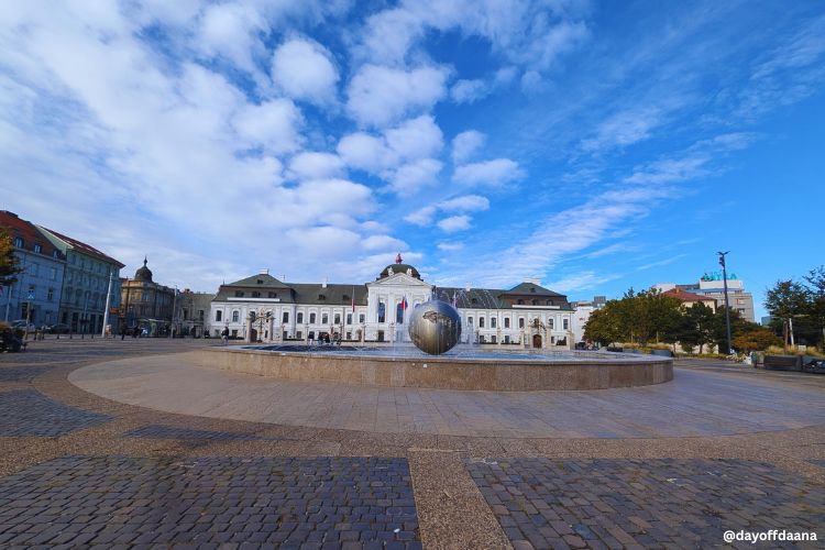 Na frente do Palacio há uma fonte com uma escultura esférica de metal, chamada “Fontána Mieru” — ou Fonte da Paz.