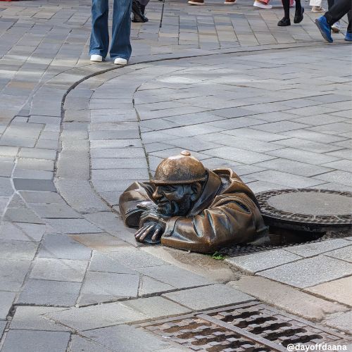 A estátua de bronze mostra um trabalhador saindo de um bueiro, com um sorriso enigmático.
